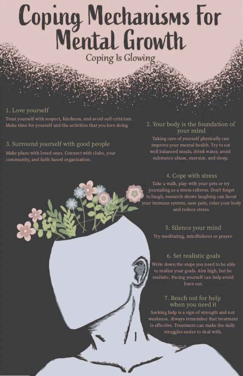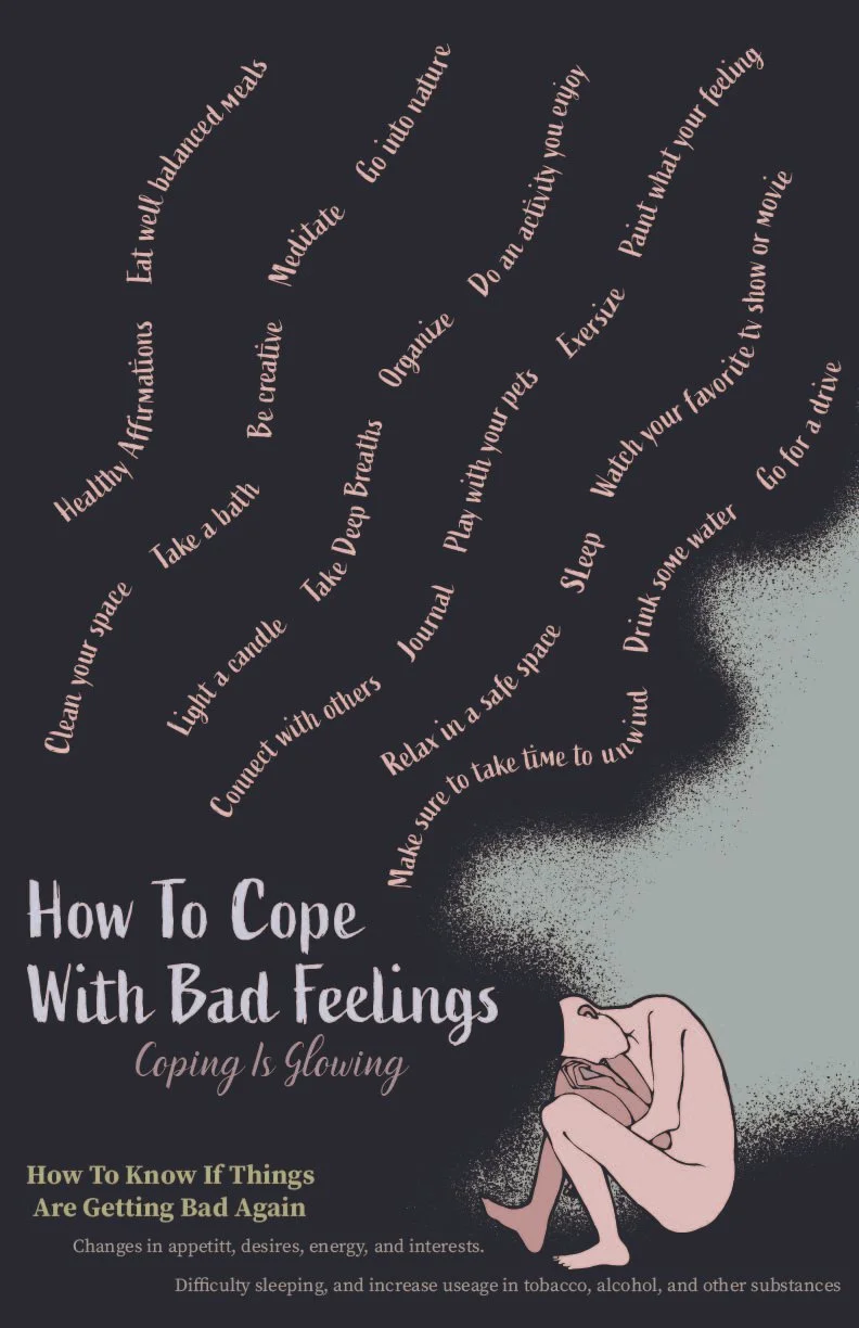 Presenting a trio of mental health posters, each crafted to inspire and support. The first is a visually captivating graphic, a vivid portrayal of the complexity of emotions. The other two offer practical coping strategies, from managing anxiety to practicing self-care. Together, they form a unified message of solidarity and resilience, reminding viewers they are not alone in their journey toward mental well-being.